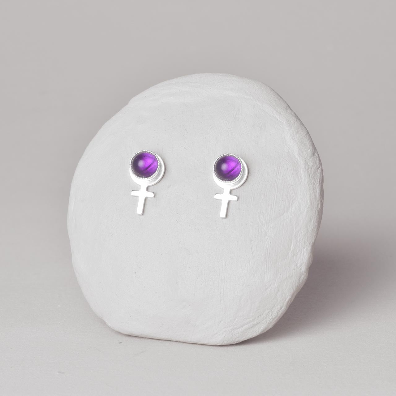 Ett par (2st) handtillverkade feministörhängen i 925 sterling silver med cabochonslipade ametister. Längd ca 12mm. Notera att färgskiftningar i stenen kan förekomma då detta är en naturlig ädelsten. Även färgskillnader kan förekomma.