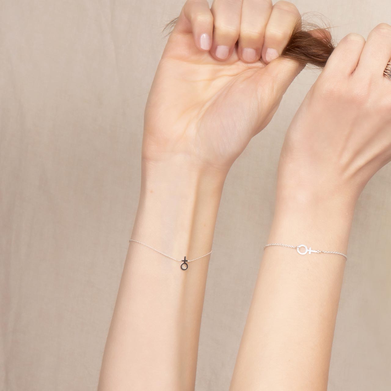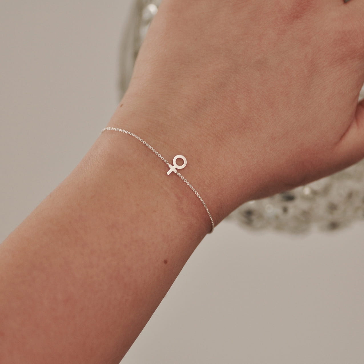 Feministarmband silver 1mm rundankarkedja med kvinnotecken i silver 9mm. 16cm-21cm långt, du kan själv variera längden genom att knäppa låset i önskad längd i förlängningskedjan.