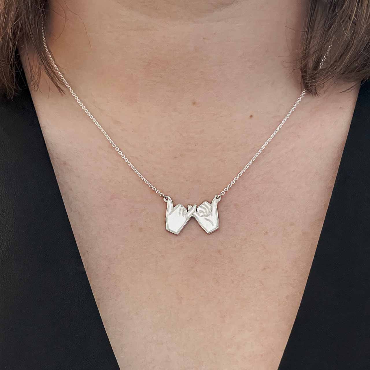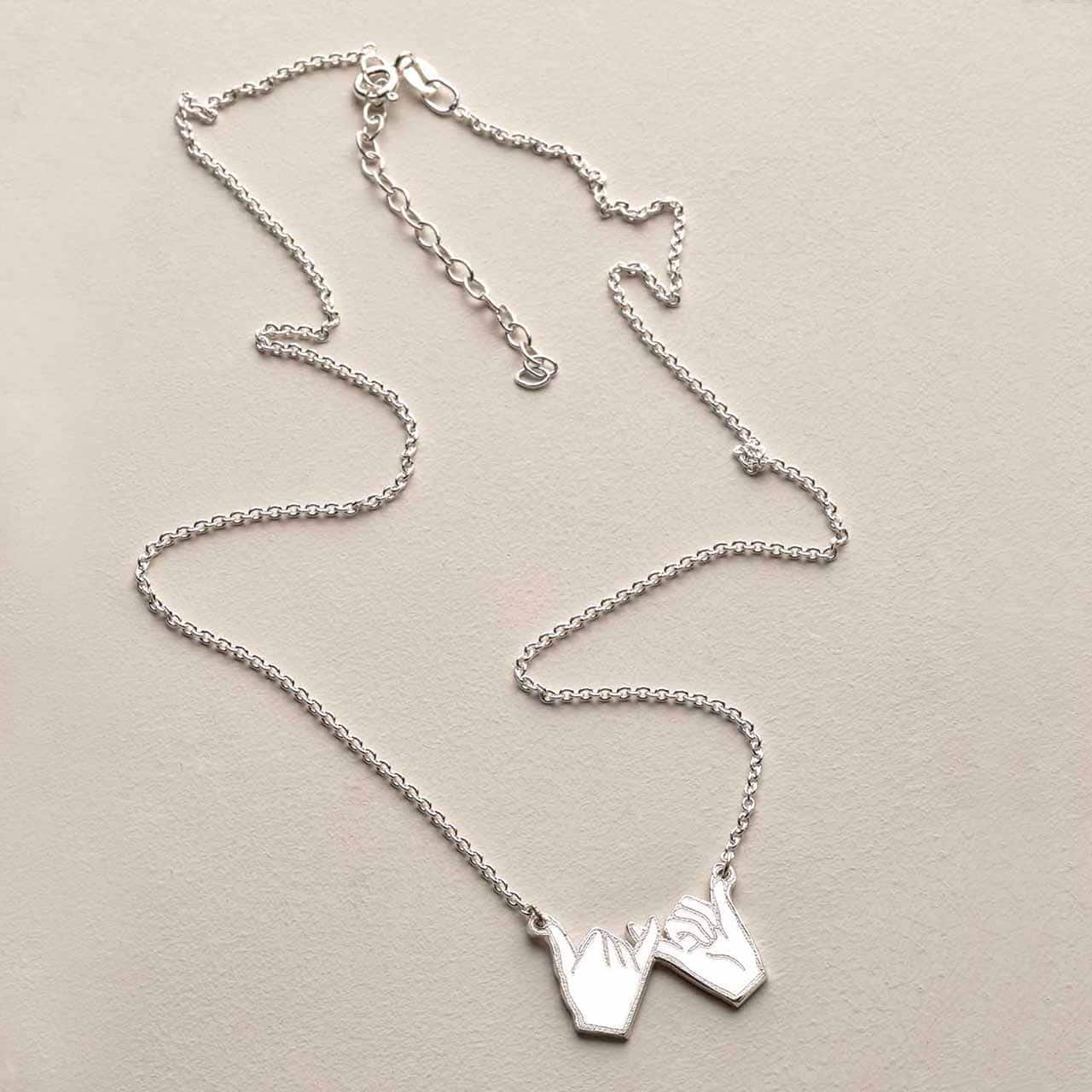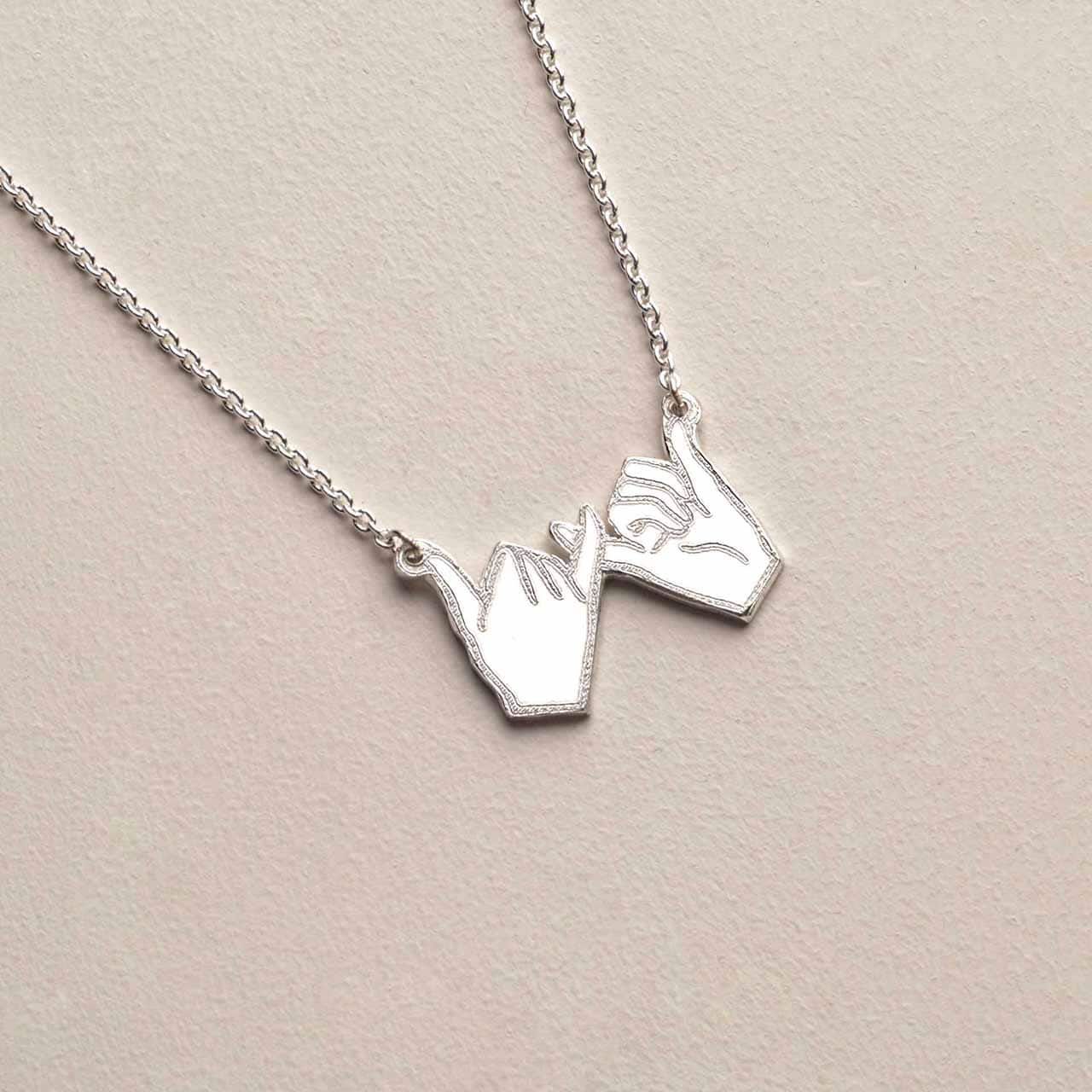 Handtillverkat halsband i sterling silver designat av Hadil Mohamed och skapat av Feministsmeden för Maktsalongens 10-års jubileum. Pinky Swear: För att visa att systerskap är ett löfte, ett löfte om att alltid finnas där för varandra. För att visa att vi alltid stöttar och peppar varandra, kvinna till kvinna. Händerna mäter 17x13mm med kedja och förlängningsdel som kan knäppas mellan 44-49cm.