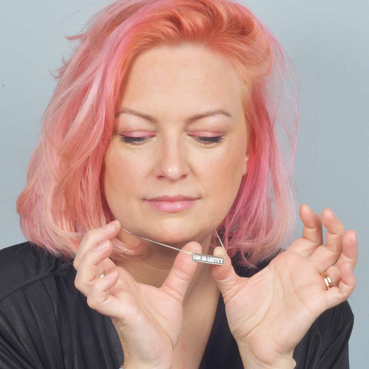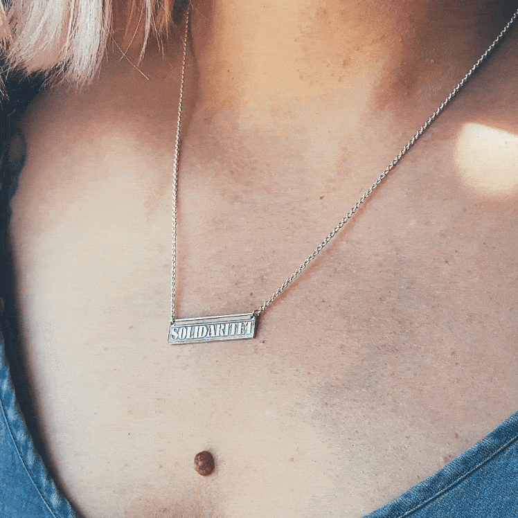Detta halsband är en symbol för solidaritet och en påminnelse om vikten av att stå upp för mänskliga rättigheter och kämpa för alla människors lika värde. Halsbandet är tillverkat av återvunnet silver och har en avlång bricka med en svart bakgrund och ordet "Solidaritet" i silver. Kedjan är 41-46cm lång. och har en förlängnings kedja så det går att variera längden. För varje sålt halsband går 50 SEK till Amnesty International som är en global organisation som arbetar för att främja och skydda mänskliga rättigheter över hela världen. De kämpar för att alla människor ska behandlas med respekt och värdighet och arbetar för att avslöja och stoppa övergrepp mot mänskliga rättigheter.