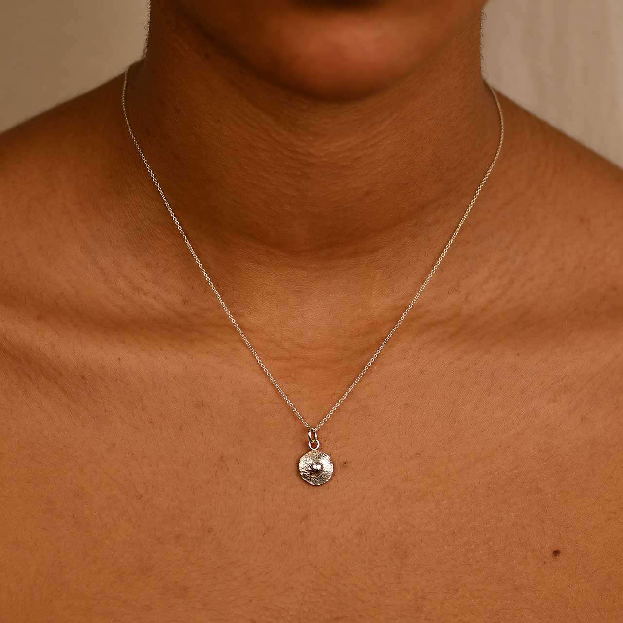 Handtillverkat hängsmycke i 925 sterling silver där varje bröstvårta blir unik. Ca 10mm ø. Säljs utan kedja, Syns här tillsammans med silverkedjan som är 1mm ø