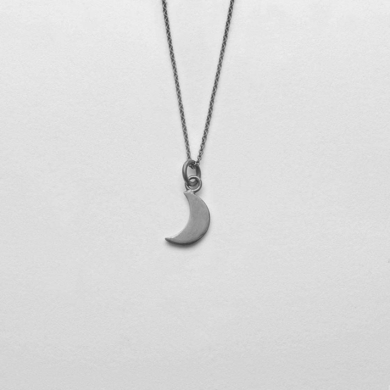 Handtillverkad liten måne i svartoxiderat 925 sterling silver som mäter ca 12mm. Inkl ögla 15,5mm Säljs utan kedja, lägg till kedja under fliken -Kedjor. Syns här tillsammans med kedjan som är 1mm ø.