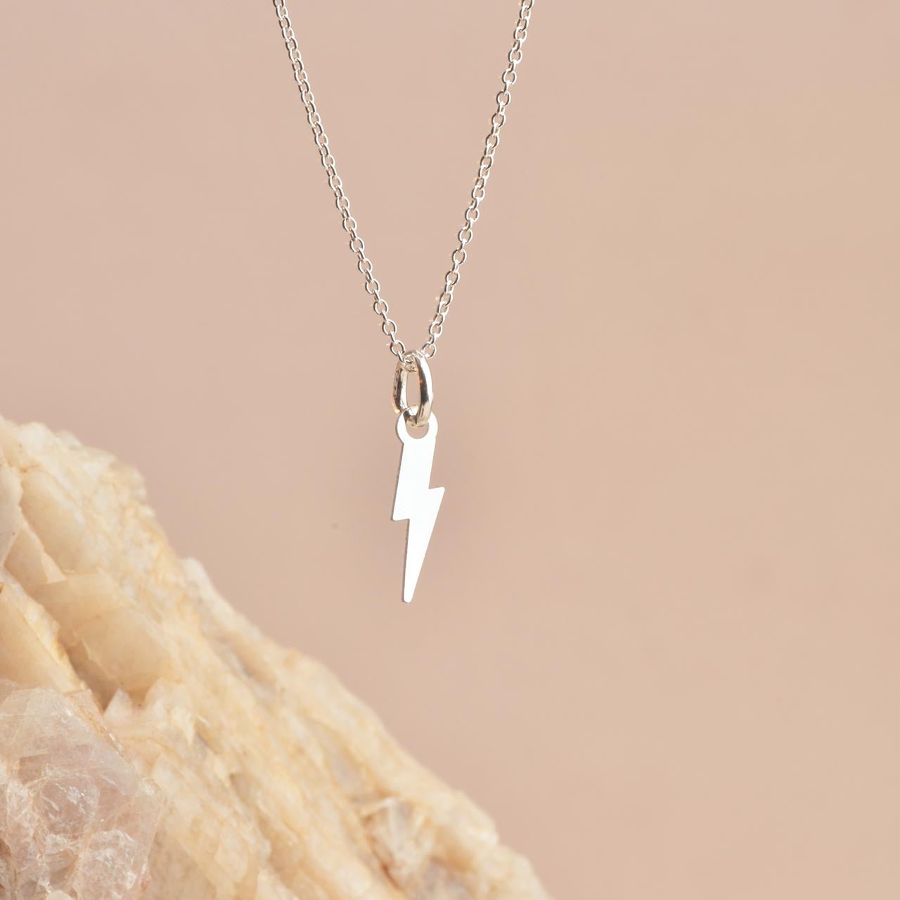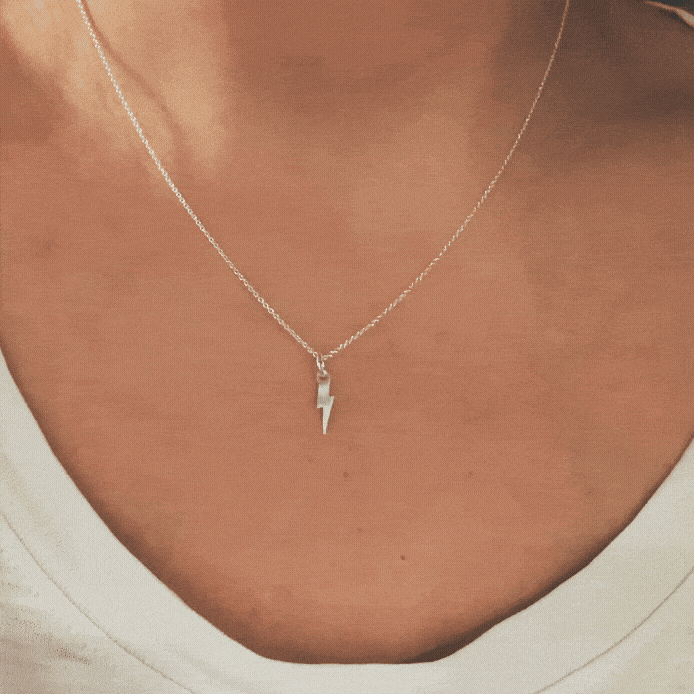 Ett hängsmycke i form av en blixt. Blankt silver. Blixten utan ögla mäter ca 10mm Handtillverkat i 925 sterling silver. Säljs utan kedja, scrolla ner för att se matchande kedjor. Syns här tillsammans med kedjan som är 1mm ø.
