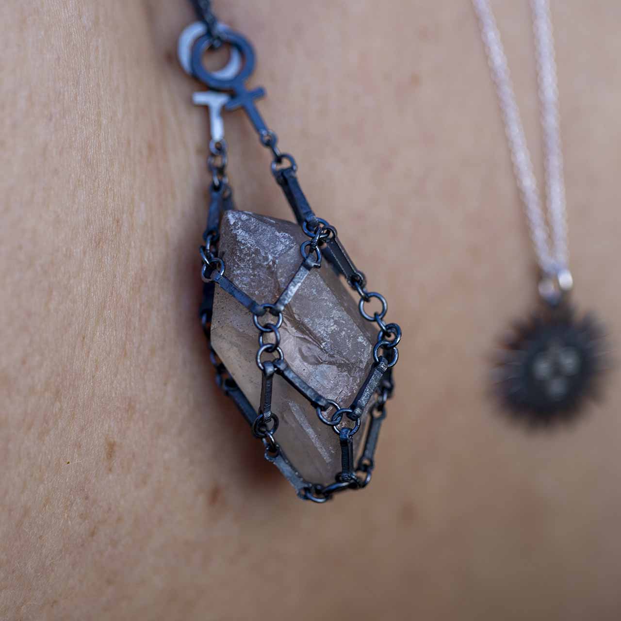 Kraftens Resonans är en kristallhållare som förbinder bäraren med uråldrig kraft och modern magi. Genom att förstärka energin från kraftstenen, skapar smycket en resonans som flödar rakt in i bärarens inre. Inspirerad av häxkonstens historia och nutida aktivism, fungerar detta smycke som både en magisk talisman och ett verktyg för den som söker styrka, helande och förnyad koppling till jorden och sig själv. En kraftfull påminnelse om att du bär både historien och framtiden inom dig. Handtillverkad i återvunnet svartoxiderat 925 sterling silver. Kristallhållaren formar sig efter din kraftsten så den kan vara rund eller avlång. Rekommenderat största mått på kraftsten är AVLÅNG FORM: 36mm lång och 16mm bred om den är avlång. RUND FORM: 21mm lång och 19mm bred om den är rund. Minsta rekommenderat mått på kraftsten är 25mm lång och 9mm bred.