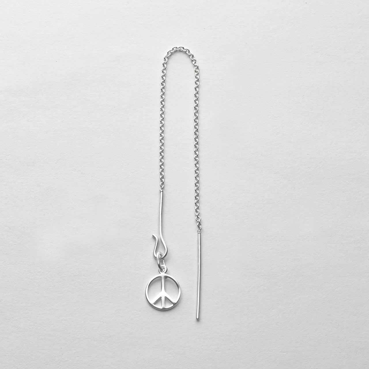 1st dinglande örhänge med Fredssymbol / peace-tecken där kedjan dras genom örat för önskad längd. Fredstecknet i sterling silver mäter ca 10mm ø. och kan enkelt krokas av för att då användas som hänge på en halskedja! Du får även med ett bakstycke att sätta på den hårda pinnen på kedjan och kan då använda örhänget i full längd vilket är ca 16cm. Välj mellan blank silver eller svartoxiderat silver. OBS, endast 1st örhänge för 1st öra.