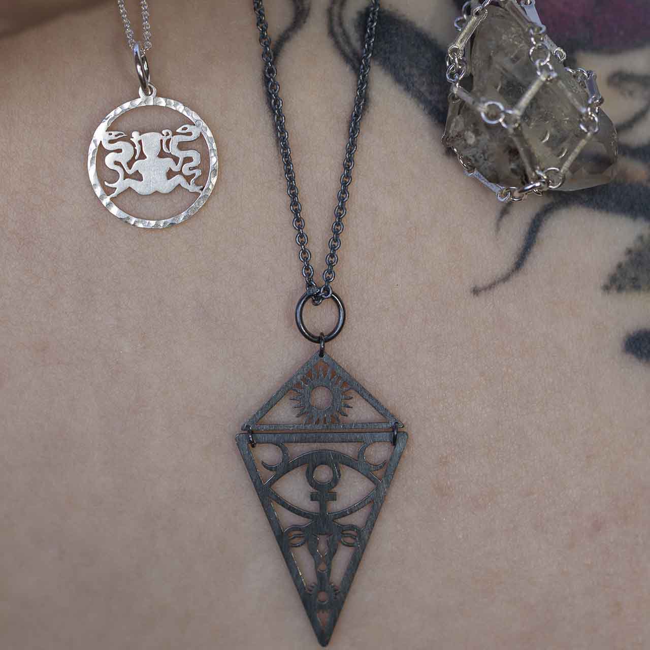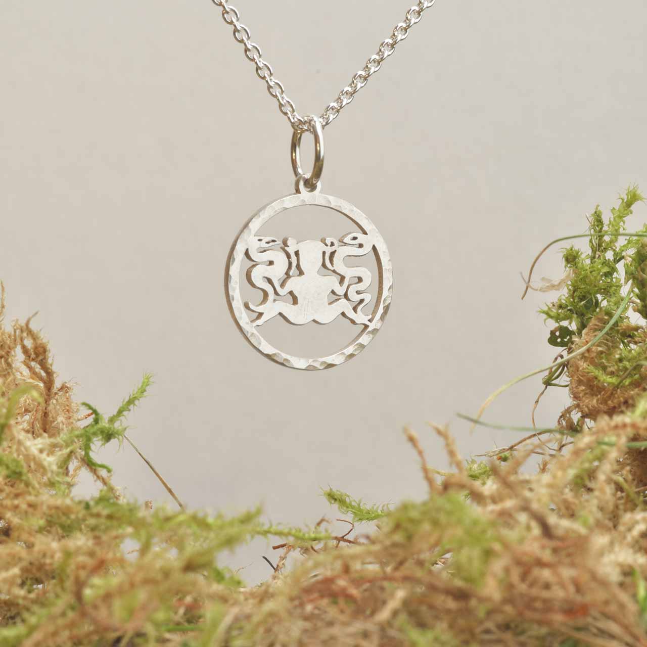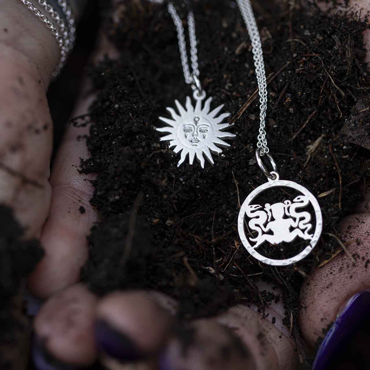 Ormkvinnan hängsmycket är inspirerat av en uråldrig bildsten från Gotland, daterad till cirka 400-600 e.Kr., som avbildar en kvinna med särade ben och en orm i vardera handen. Denna kraftfulla avbildning symboliserar kvinnlig styrka, visdom och förmågan att kontrollera kaos och förvandling. Ormen, en symbol för transformation och förnyelse, slingrar sig genom hennes händer, och kvinnans position talar till en djup förbindelse med jordens och kroppens krafter. Smycket fångar denna urkraft och förmedlar en tidlös koppling till kvinnans makt och mystik Hängsmycket är en hyllning till urmodern, där ormens slingrande form symboliserar kopplingen mellan kvinnans kropp och naturens oändliga kretslopp av liv, död och återfödelse. Tillverkad i återvunnet 925 sterling silver.