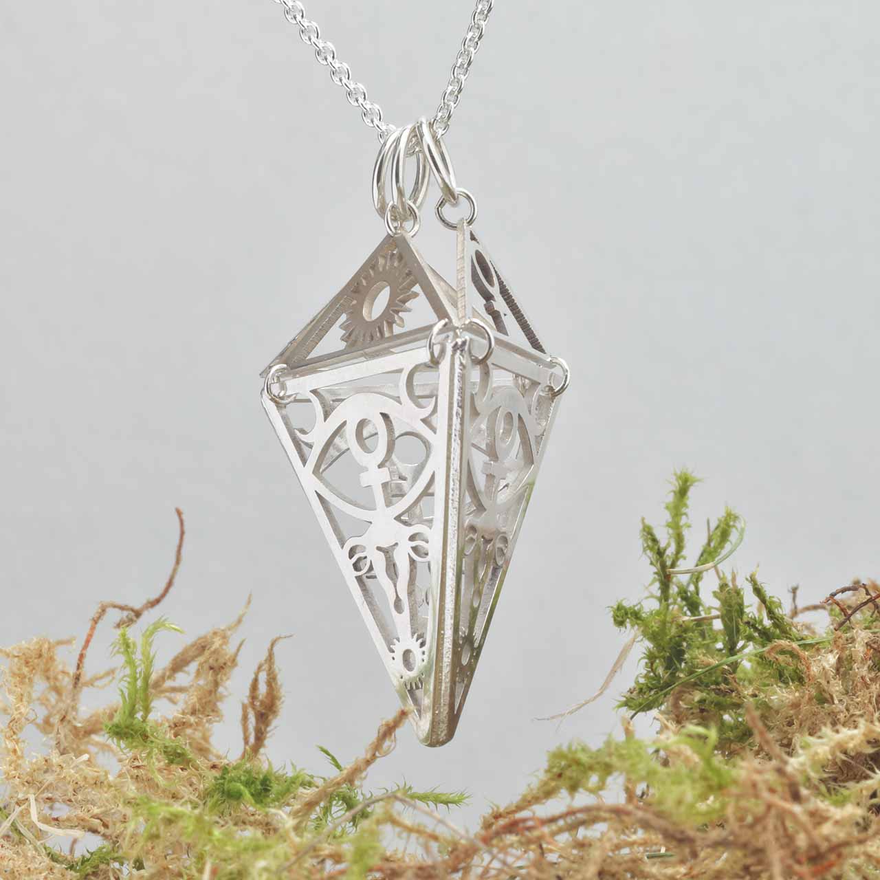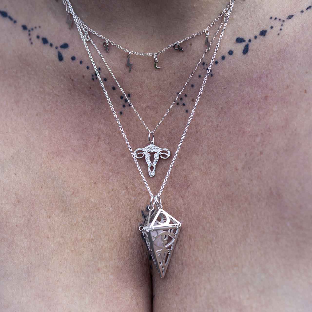 Urmoderns Kammare är en kraftfull kristallbehållare designad för att påminna bäraren om sin djupa koppling till den uråldriga kvinnliga kraften. Tre sammanlänkade sidor med samma mönster som Urmoderns Kammare formar en kon, och locket är prytt med tre mindre trianglar – solen, månen och kvinnosymbolen. Dessa symboler representerar livets cykler, energier och kvinnlig styrka, och kristallbehållaren fungerar som en kanal för att förmedla och förstärka kristallens kraft. Smycket är en beskyddande kammare för den magi som bäraren bär inom sig. Handtillverkad i återvunnet 925 sterling silver. Säljs utan kedja. Kraftsten som passar i kan inte vara längre än 22mm och bredare än 9mm. Tänk på att kammaren är spetsig och nedersta innermåttet är 5mm och högst upp 14mm. så. långsmala eller spetsiga kraftstenar passar bäst. Mäter 35mm på längden och den bredaste punkten på triangeln är 21mm