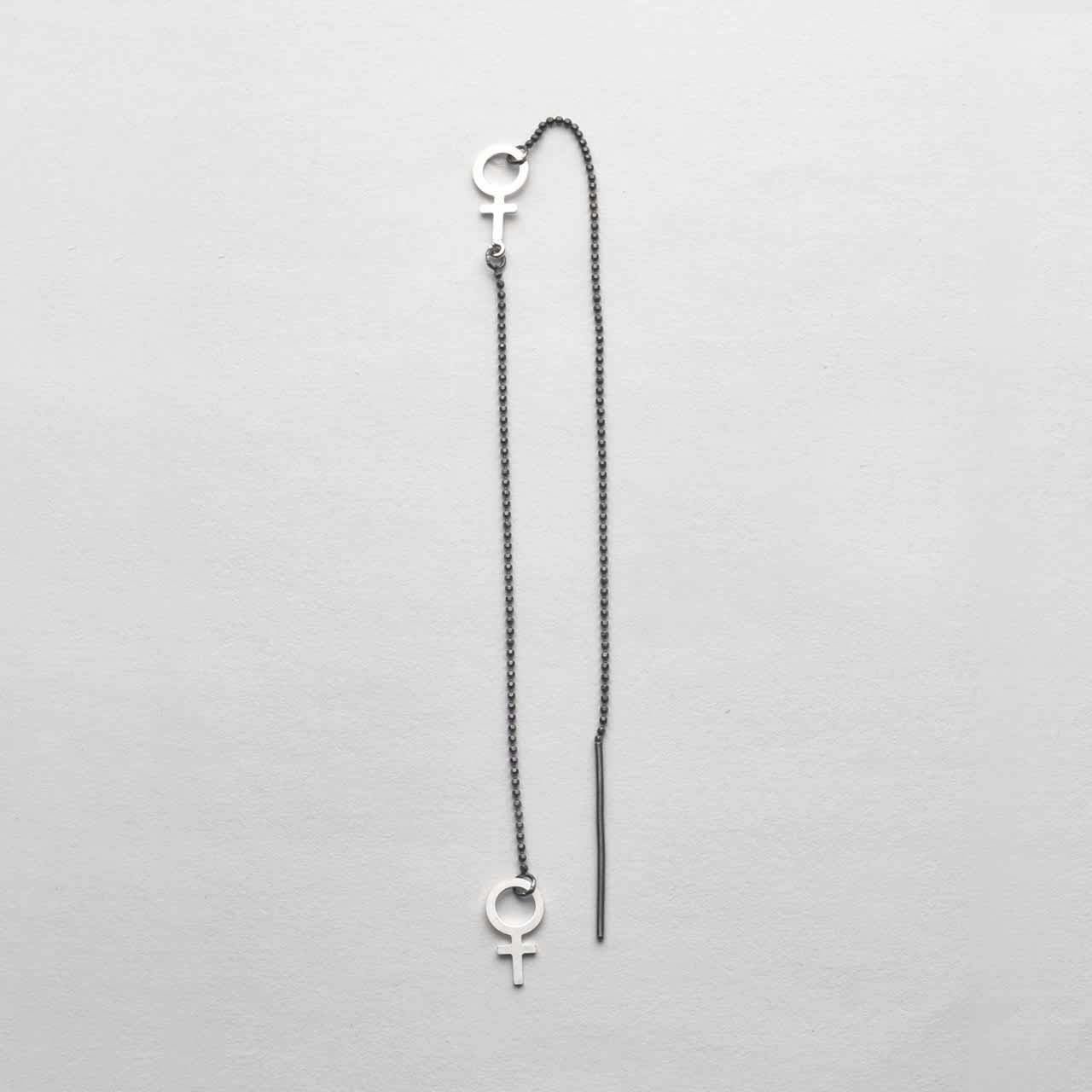 One (1st) long dangling feminist earring with two shiny female symbols and a black oxidized chain. The chain is threaded through the ear so that one female symbol rests on the earlobe. Length approx. 11 cm. Handmade in sterling silver and sold individually; if you want two earrings, add two pieces to the cart.