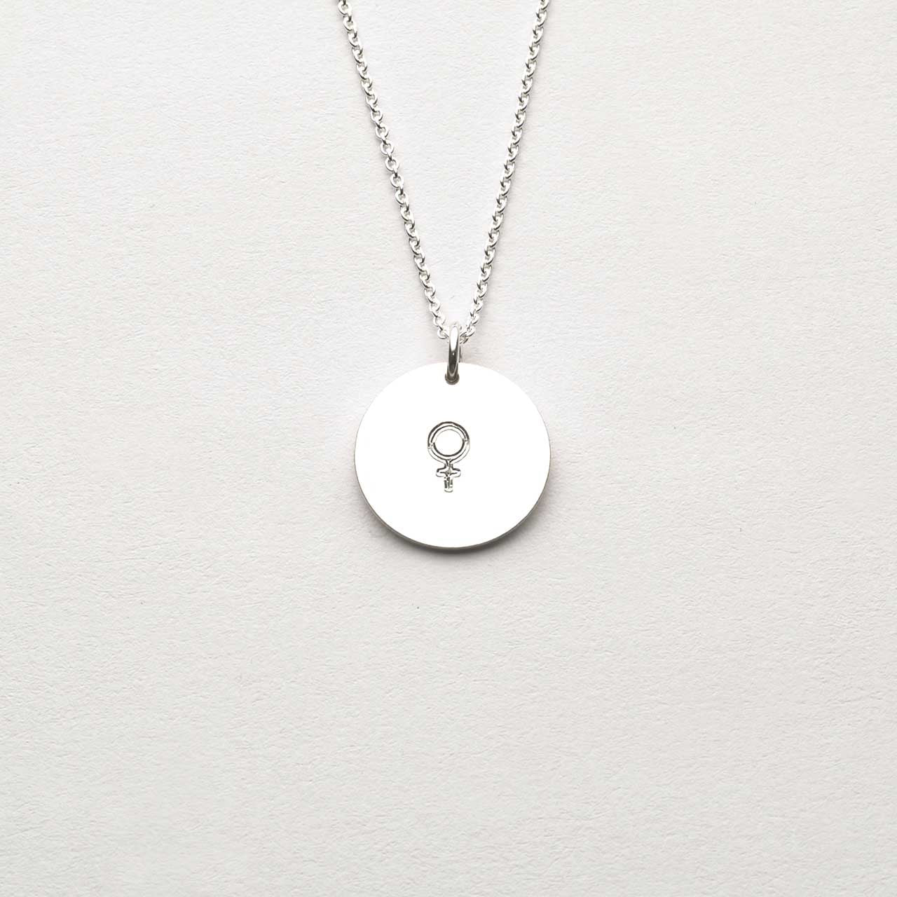 Engraved round pendant in 925 sterling silver with a small polished female symbol engraved in the center on one side. 15mm in diameter Ø Add your own personal engraving on the back, choose between Cursive or Block style. NOTE: It is not possible to return or exchange jewelry with personal engraving.