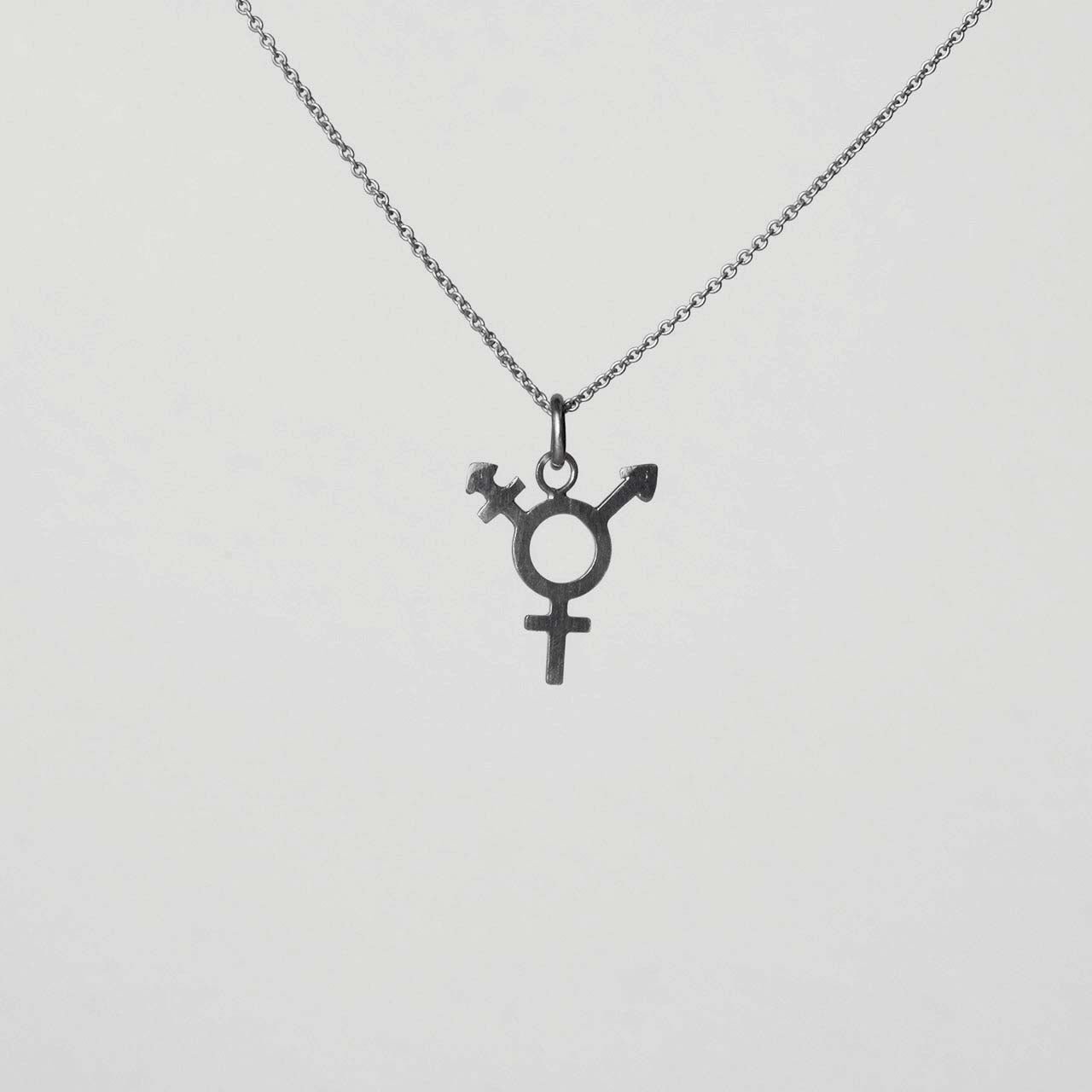 Handmade trans symbol pendant in black oxidized 925 sterling silver, approx. 14mm. Without chain, add a chain under the -Chains tab. Shown here together with the black oxidized chain, which is 1mm ø.