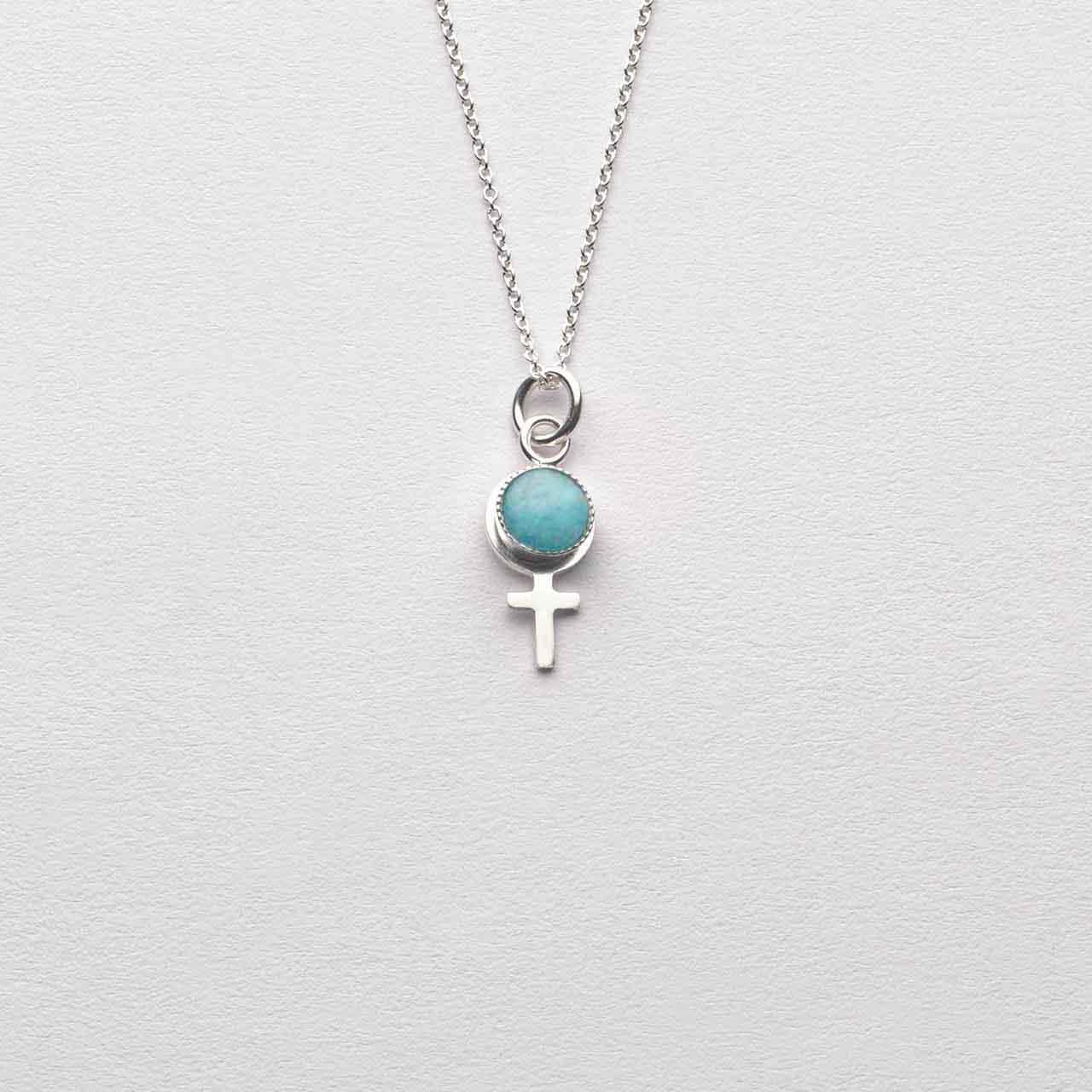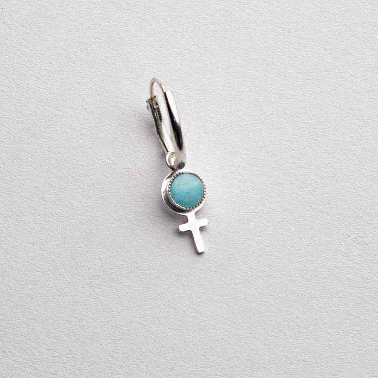 Handtillverkat feministsmycke i 925 sterling silver med cabochonslipad amazonit 5mm ø. Välj i rullisten om du vill ha det som ett hänge eller örhänge. Smycket säljs styckvis och kedja läggs till under fliken - Kedjor. Hänget mäter 20mm inkl ögla. Örhängets längd 28mm varav hoop mäter 14mm ø.