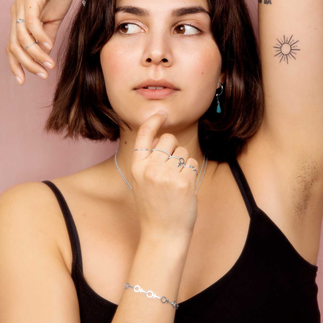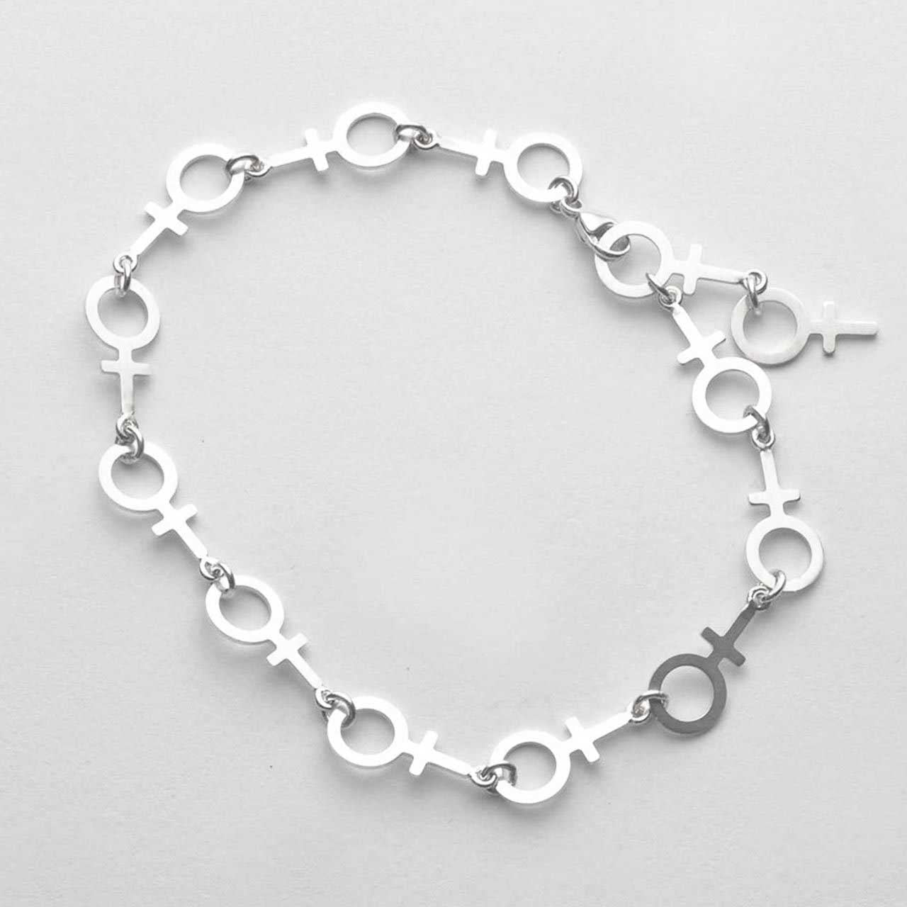 Handtillverkat armband i 925 sterling silver med 13st sammansatta feministsymboler som mäter 12mm st total längd ca 20cm inkl lås. Du kan själv variera längden genom att knäppa låset i önskad längd i de olika kvinnosymbolerna, max längd 20cm TILLSAMMANS ÄR VI STARKA