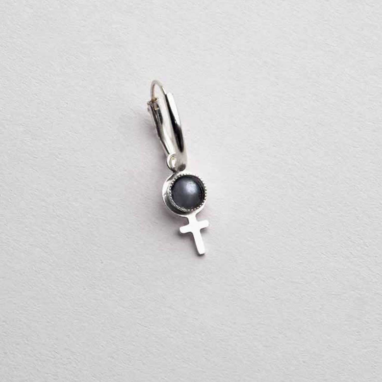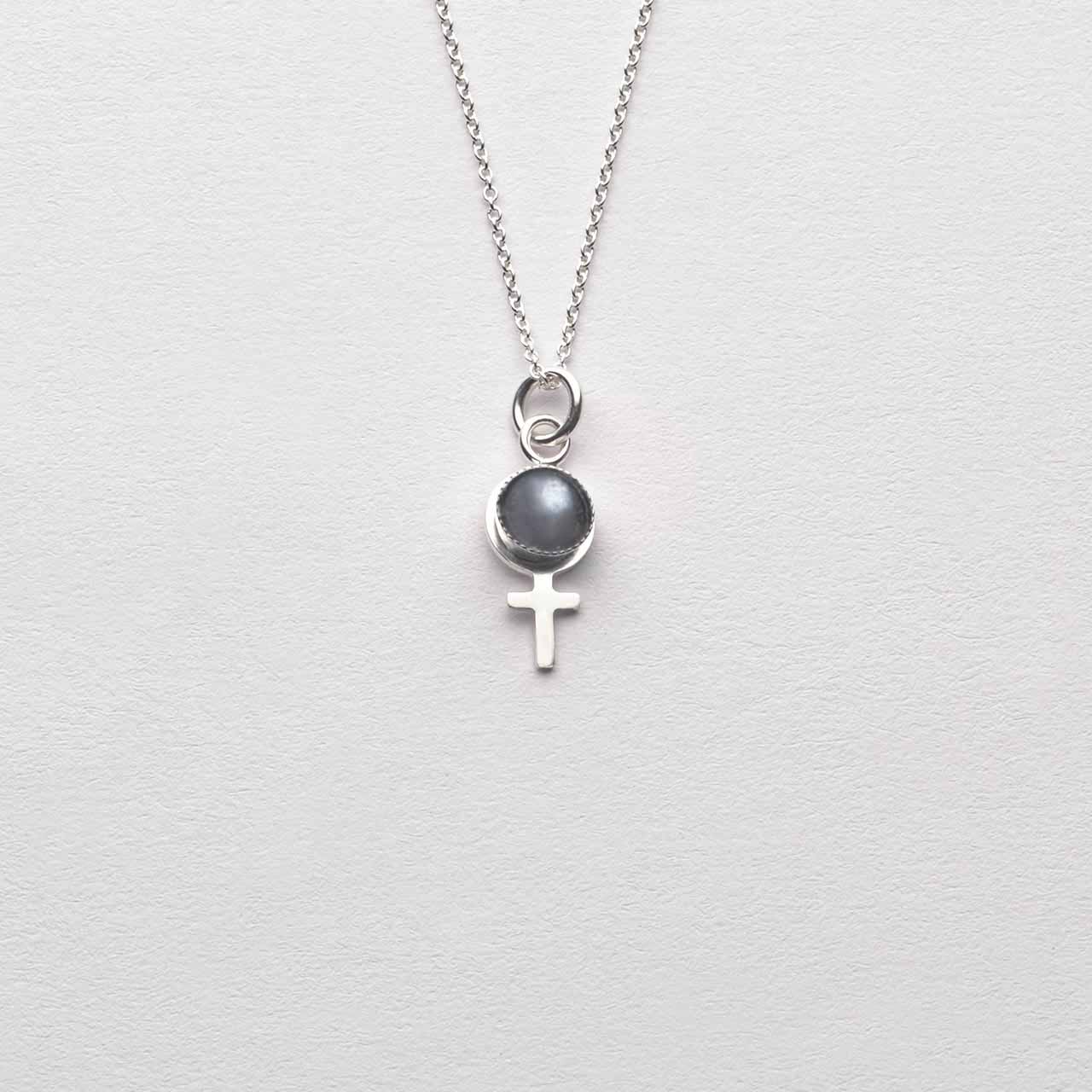 Handtillverkat feministsmycke i 925 sterling silver med cabochonslipad hematit 5mm ø. Välj i rullisten om du vill ha det som ett hänge eller örhänge. Smycket säljs styckvis och kedja läggs till under fliken - Kedjor. Hänget mäter 20mm inkl ögla. Örhängets längd 28mm varav hoop mäter 14mm ø.