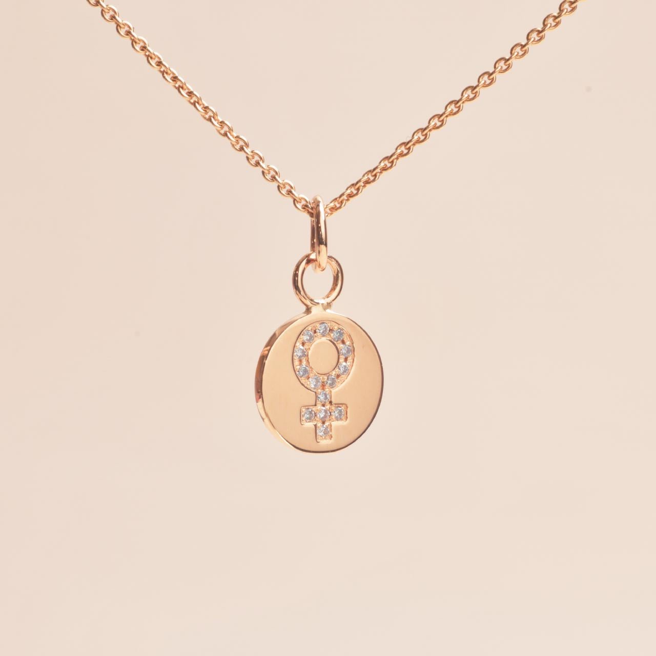 Feministhänge i 18k guld med 14st små 0,005ct W.SI, briljantslipade diamanter som bildar ett kvinnotecken. Plattan mäter 10mm ø 1mm tjock och total längd inkl ögla 20mm. OBS Tillverkas efter beställning, leveranstid ca 2-3 veckor.
