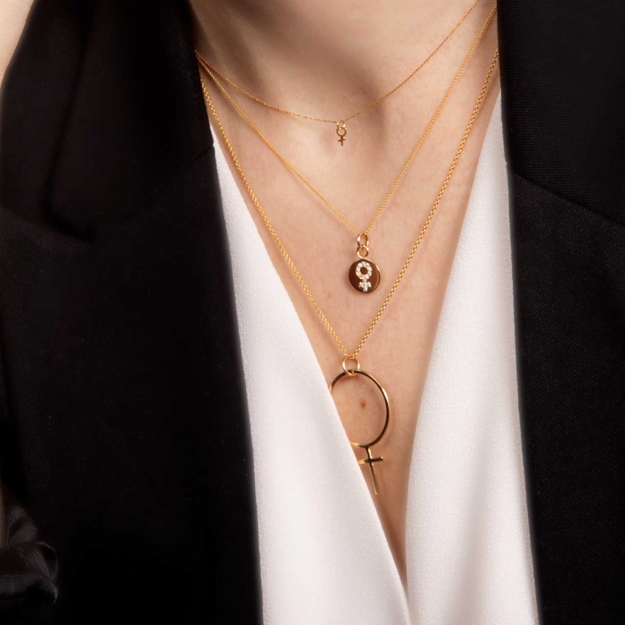 Handtillverkad stort feministhänge i 18k guld. Kvinnotecknets längd mäter ca 35mm. Säljs utan kedja, scrolla ner för att se guldkedjor som passar till. Hänget syns här tillsammans med 18k guldkedjan som är 1mm ø och 42cm lång.